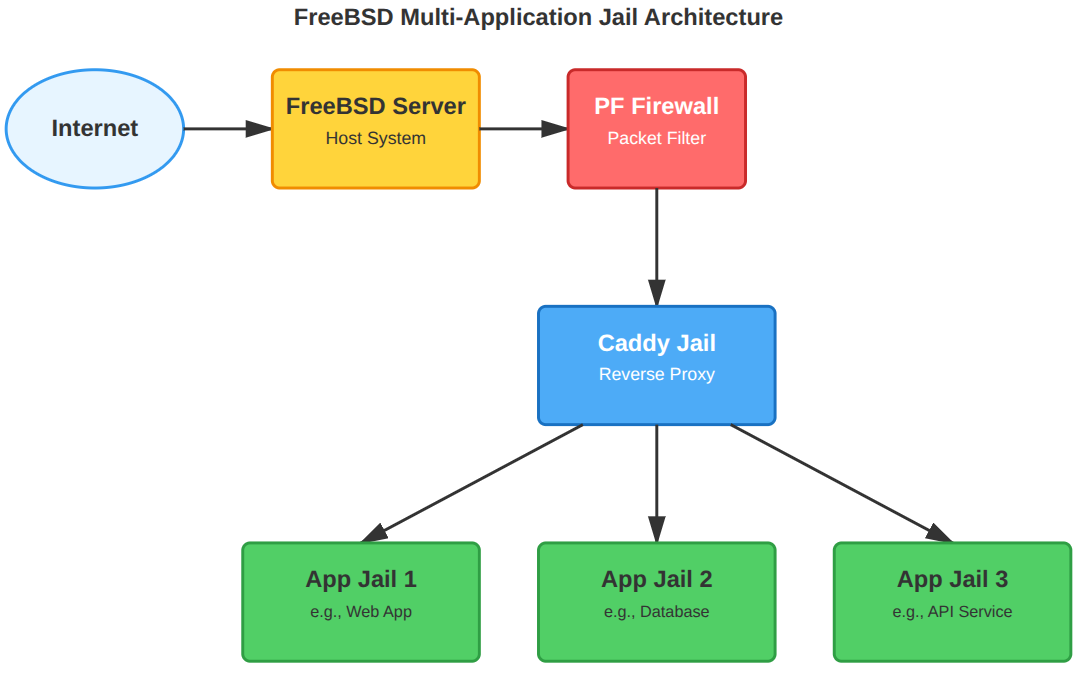 Each app gets its own isolated jail for security, while Caddy handles all the routing and https. PF keeps the front door locked.