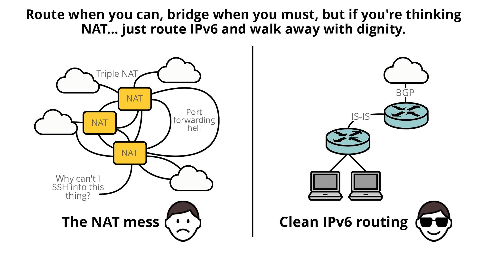 Wow, multiple responses to this one, and not one of them is somebody defending how great NAT is, and/or how IPv6 is too hard, doesn't actually fix any real problems, etc....